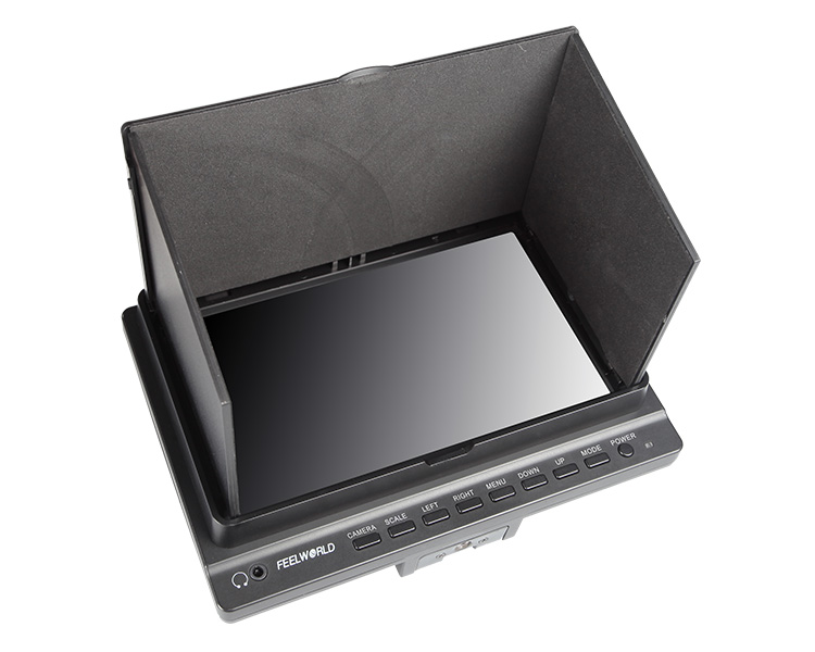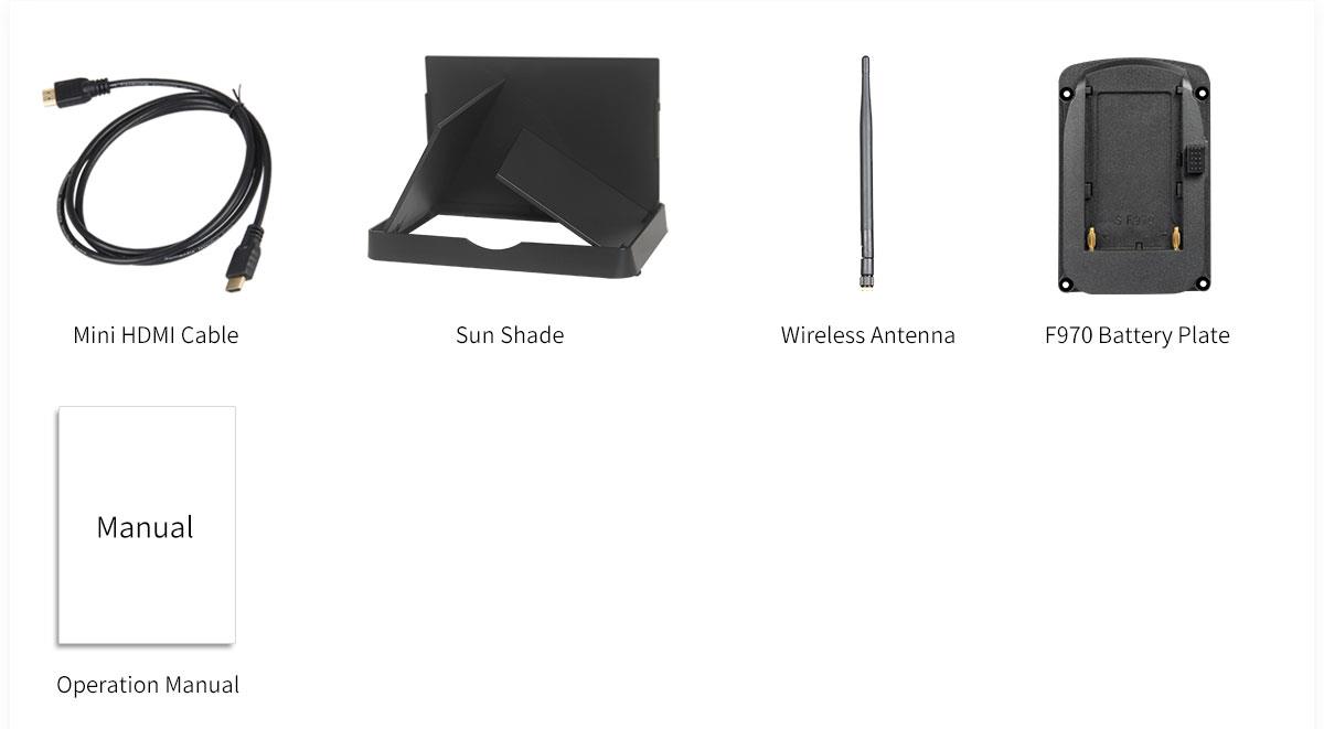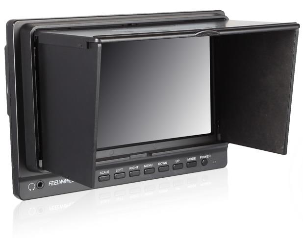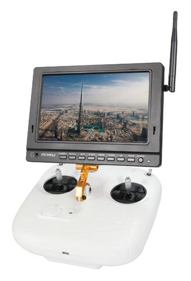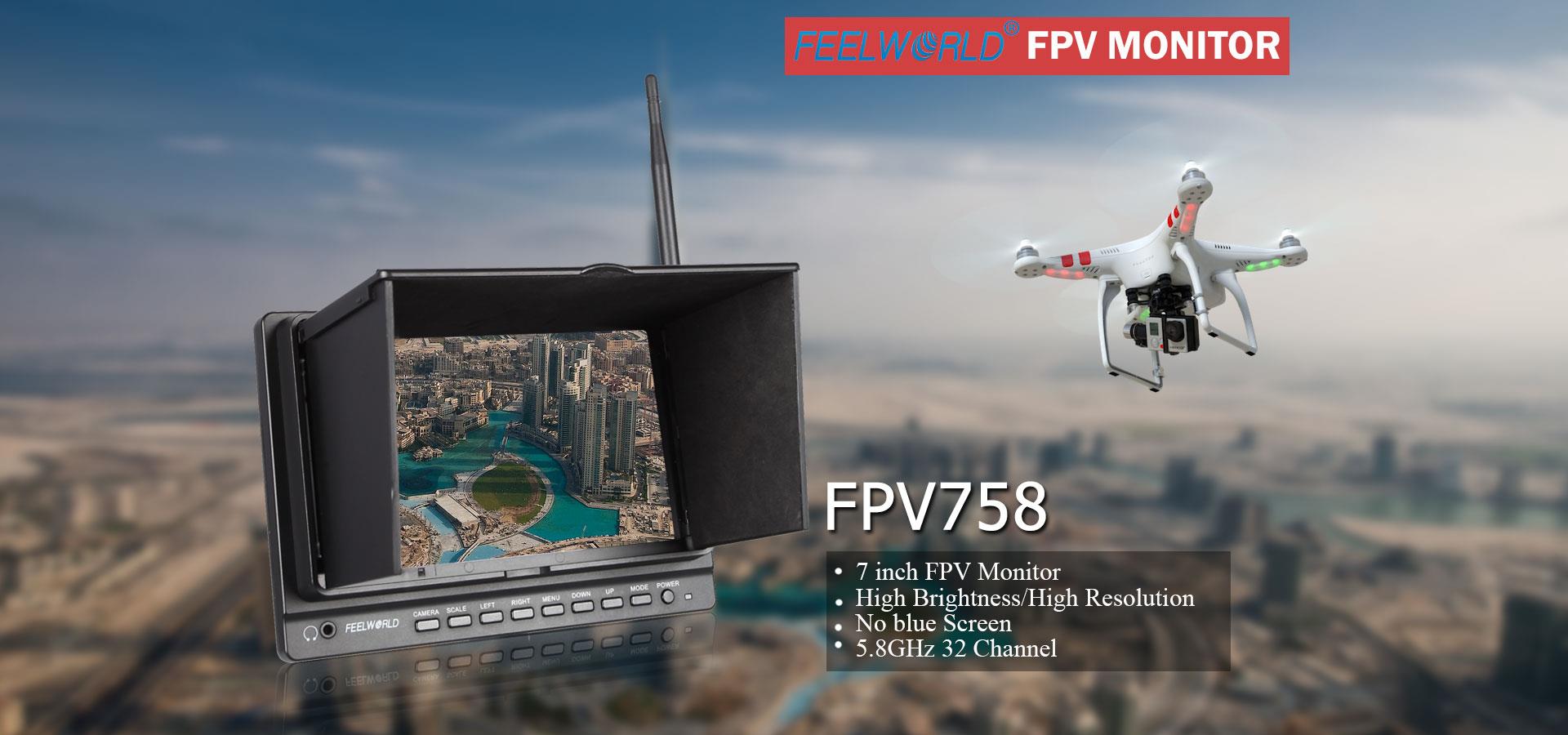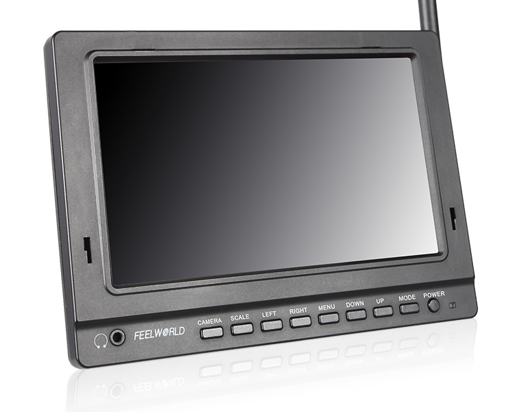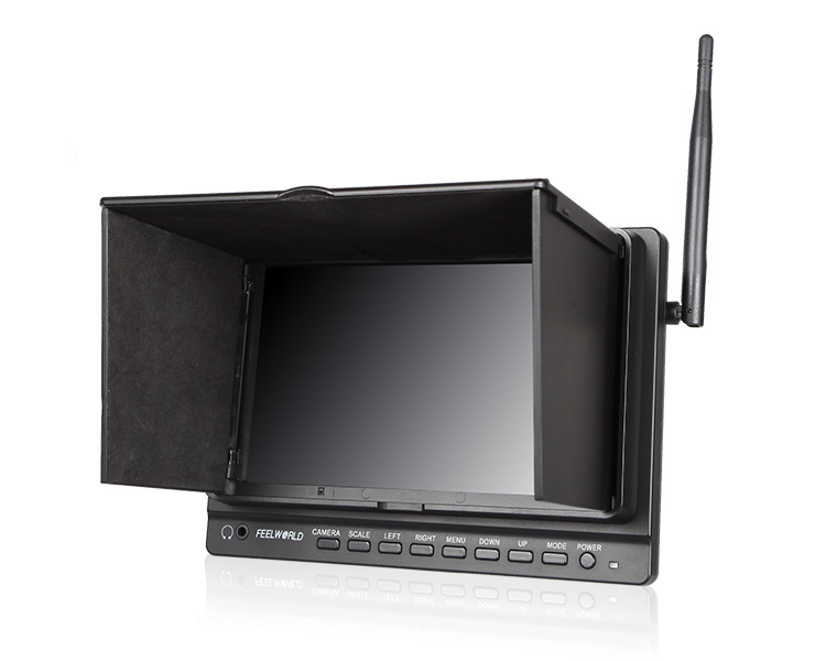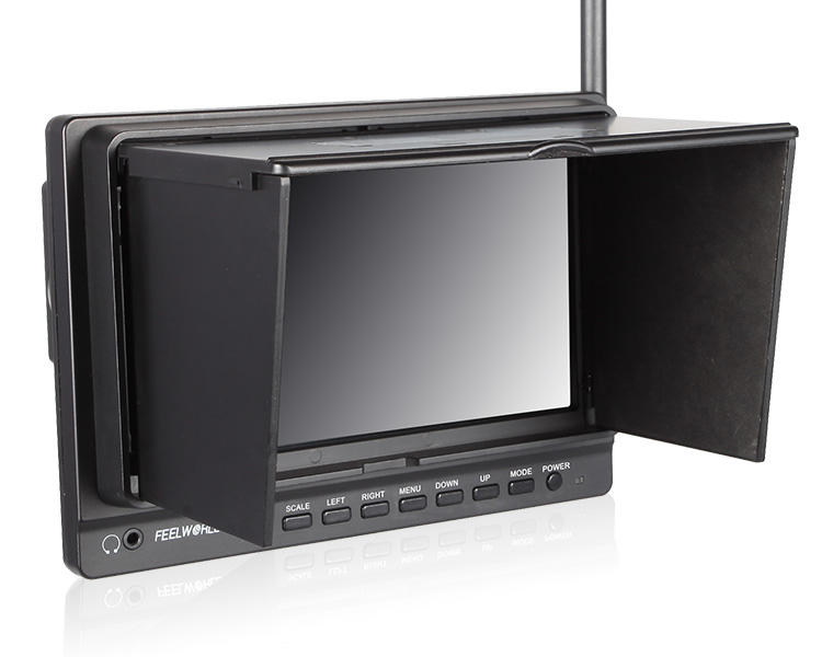Combining analog and digital signal inputs, the FEELWORLD FPV758 7" Wireless LCD Monitor is suitable for use as a first-person viewing (FPV) device for use with the wireless feed from optional RC aircraft mounted cameras (Aerial Imaging Platforms). It features a 7" screen with 1024 x 600 resolution, which allows you to view either SD or HD video with minimal scaling or windowing providing a large image no matter what the resolution of your video. It supports 32 channels across 4 wireless bands and incorporates a built-in 5.8 GHz receiver, which is compatible with optional DJI transmitters, as well as other optional 5.8 GHz transmitters. The monitor takes an RF signal via a single antenna, and as it is an analog signal, the monitor allows the image to degrade but remain visible as the signal fades, instead of displaying a blue or black screen as most digital monitors will once the signal falls below a certain threshold. It also accepts a composite signal, which features a loop through output, and an HDMI input. The monitor is powered by optional Sony L Series type batteries, via the built-in L type battery plate. You can also use it with an optional DC power adapter if you want to use it from an DC power outlet. A removable plastic sun hood provides protection from the glare and direct exposure of the screen to sunlight.