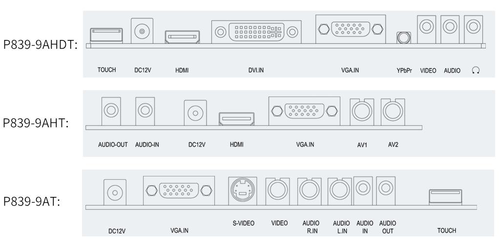 | P839-9AHDT: HDMI, DVI, VGA, YPbPr, Video, Audio in, Audio out, USB for touch |
