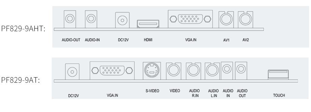| PF829-9AHT: HDMI, VGA, AV1, AV2, Audio out, Audio in |